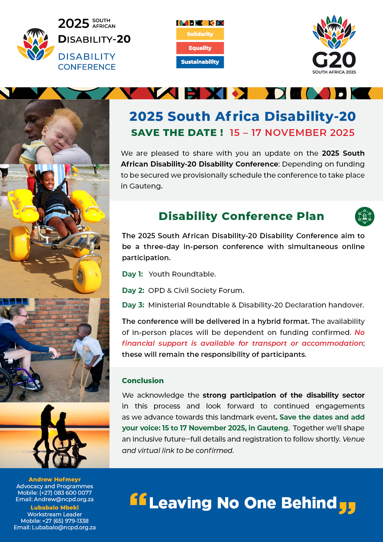 To advocate for the rights and freedoms of persons with disabilities in South Africa, representing various organisations, and addressing shared concerns and interests.